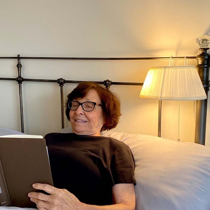 - Cream-colored pleated fabric shade softens light to protect eyes and to avoid disturbing a sleeping partner.