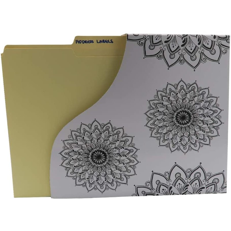 - Set of 6 black & white flower mandala design folders. Includes labels for easy identification of contents.
