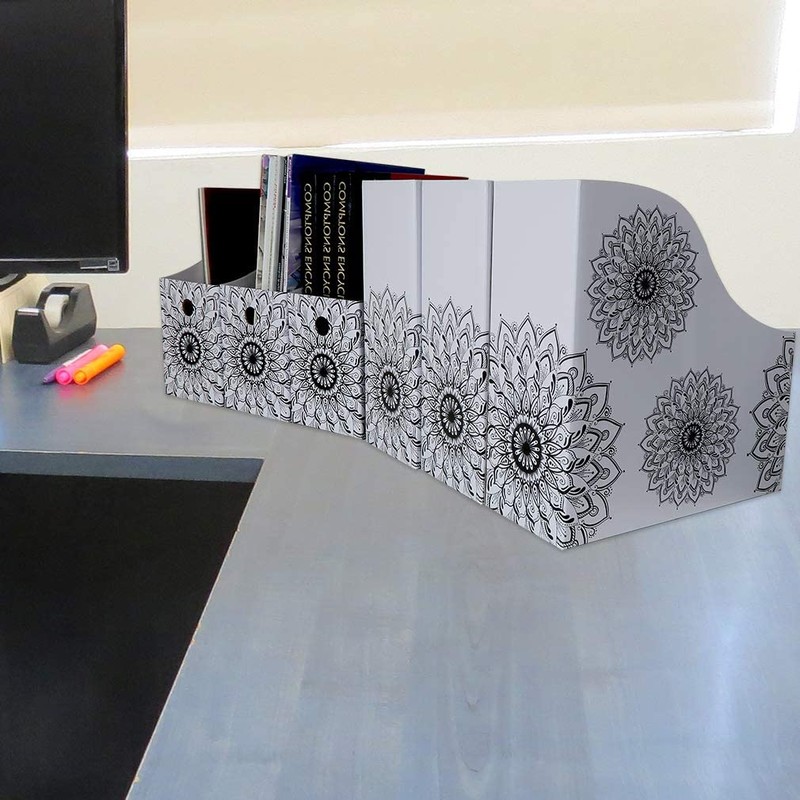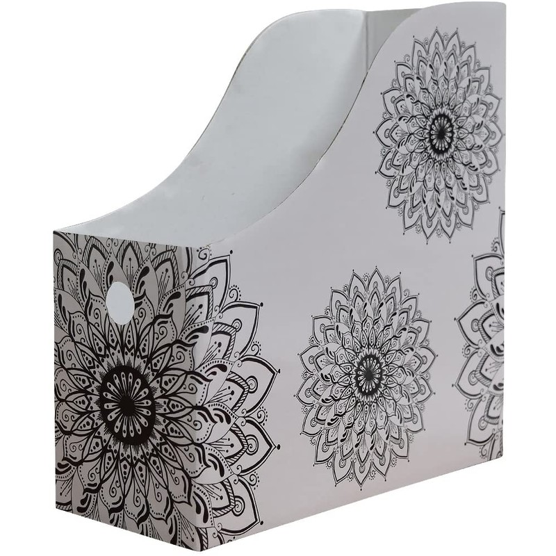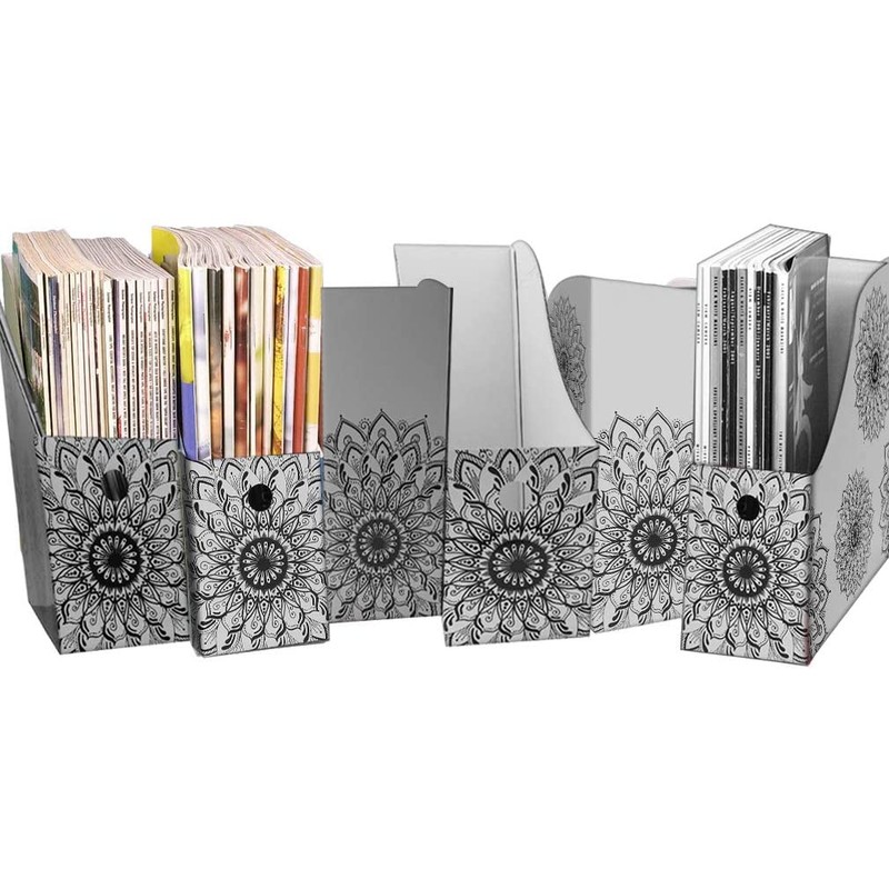 Number of Items: **6** Banish desk clutter. This set of magazine holder file boxes are great for organizing mail, catalogs, magazines, reports, file folders, and more. Store and file items long-term, or use as a narrow and unobtrusive "in-box" to help keep track of bills, school papers, homework, medical paperwork, children's artwork and more. Each file holder measures approximately 9.75 Inches Long x 4 Inches Wide x 10 Inches Height and holds standard file folders and letter- sized files. The convenient finger hole makes it easy to access file holders on the shelf. Each set comes with heavy-duty, coated cardboard folders and includes adhesive labels for easy identification of contents. Features a hand drawn black and white mandala design.