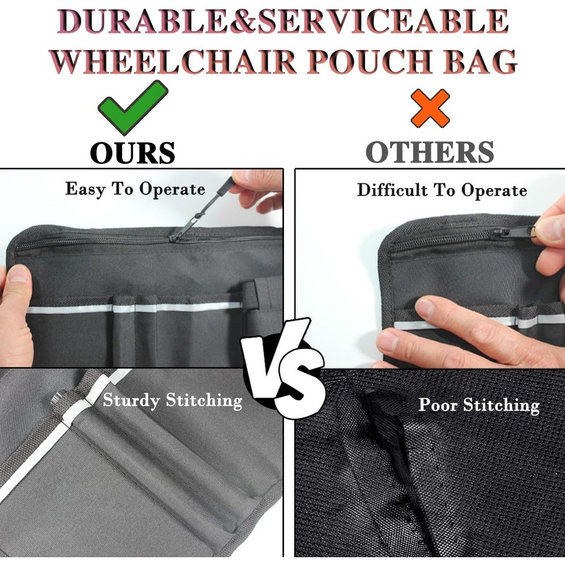 - ✅[Durable and lightweight] Double seam at the seam of the side wheelchair bag to strengthen the stress point. Made of heavy-duty nylon, this armrest organizer wheelchair is durable and can withstand years of daily use. To clean, simply wipe the waterproof nylon with a damp cloth.