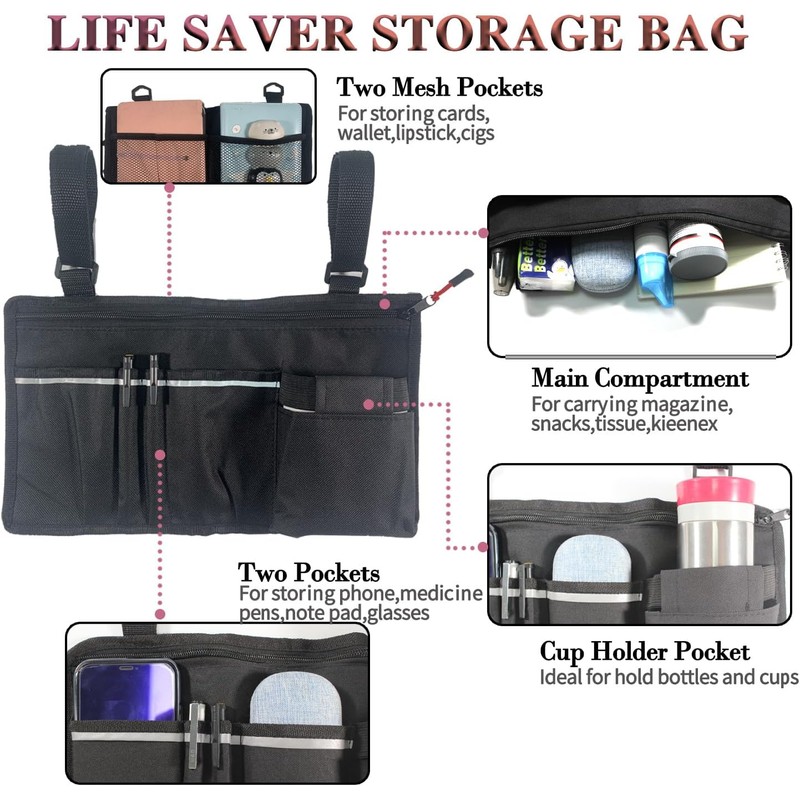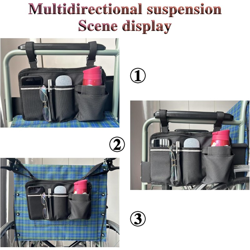 - ✅[Perfect for standard wheelchairs] Has 2 front pockets, a zipper compartment and 2 rear mesh pockets. The armrest bag has two 13.3-inch straps that fit inside or outside of electric wheelchairs, walkers, rollers, scooters, mobility chairs and rollers.