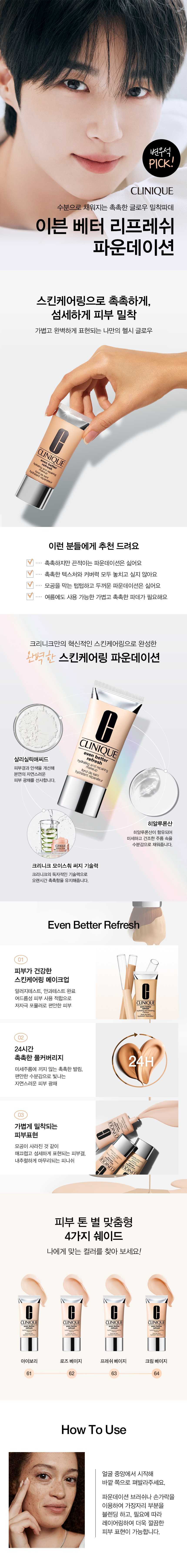 | 주요사양 | 스킨케어의 완성. 메이크업의 시작.3가지 세럼을 담은 컬러 차오르는 피부 자신감이븐베터 크리니컬 세럼 파운데이션 #트리플세럼파데크리니크만의 탁월한 기술이 파운데이션과 만나 탄생한 하루 종일 수분감 가득한 촉촉한 피부, 그리고 오랜 시간 지속되는 풀 커버리지를 경험할 수 있습니다.지금부터 스킨케어 루틴의 완성, 그리고 메이크업의 첫 시작을 크리니크 #트리플세럼파운데이션으로 만나보세요.3가지 세럼 기술이 메이크업과 만나 당신의 피부를 더욱 촉촉하게, 매끄럽게, 그리고 더욱 환하게 만들어 줄 것입니다. |