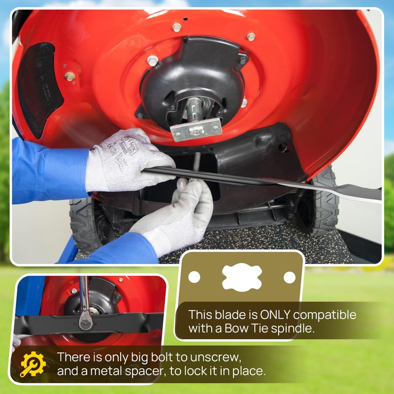 - 【BLADE SPECIFICATIONS】 For Deck Size: 21". Length: 21"(533mm), Width: 2-1/4"(57mm), Thickness: 9/64"(3.4mm), Air Lift: 1-1/8"(32mm), Center Hole Shape: Bow Tie. Note: Only fits Bow Tie spindles—confirm your mower’s center hole pattern to avoid installation issues.