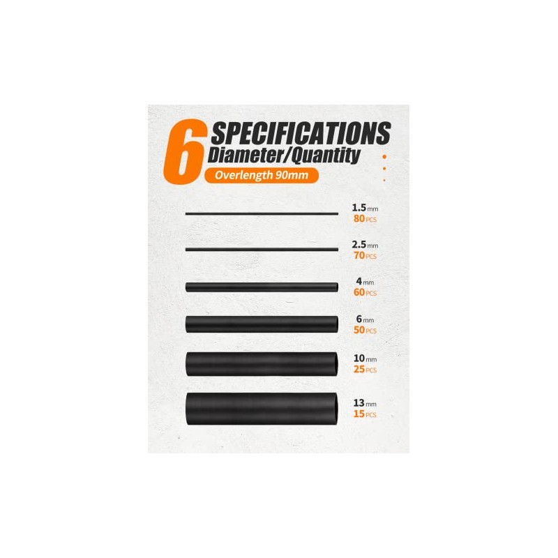 - 2025 New Upgrade: Multi-size and Overlength Heat Shrink Tubing Kit90mm, Inner Diameter1.5mm / 2.5mm / 4mm / 6mm / 10mm / 13mm.