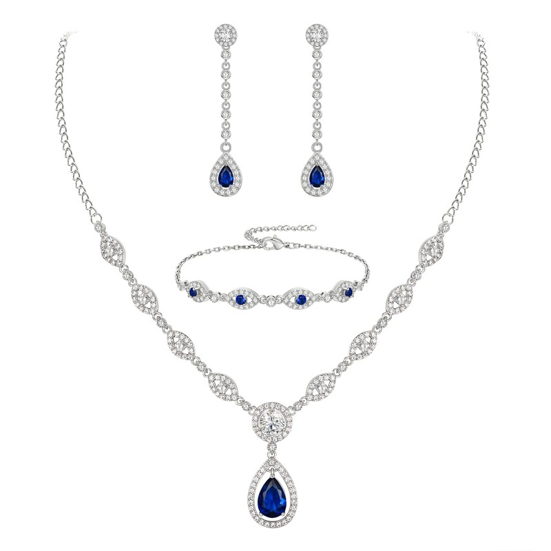 EVER FAITH Bridal Cubic Zirconia Jewelry Set Stunning Teardrop September Birthstone Necklace Bracelet Earrings Set for Woman Sapphire Silver-Tone