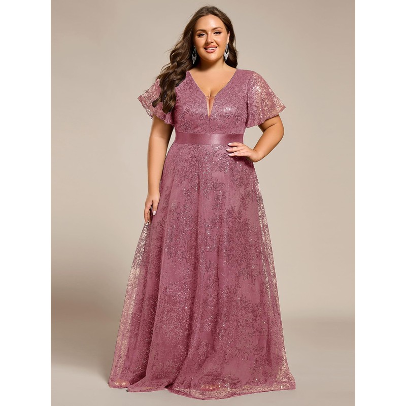 - Features: v neck, unique embroidered sequin fabric, a line, ruffles sleeves, empire waist, crafted from no stretch fabric, not padded, with lining, concealed zipper up the back, plus size formal dresses, plus size evening dresses