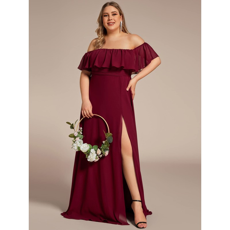 Ever-Pretty Women's Off Shoulder Short Sleeves Empire Waist Side Split Chiffon Flowy Plus Size Summer Bridesmaid Dresses Burgundy US18