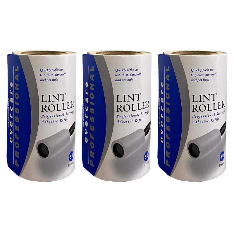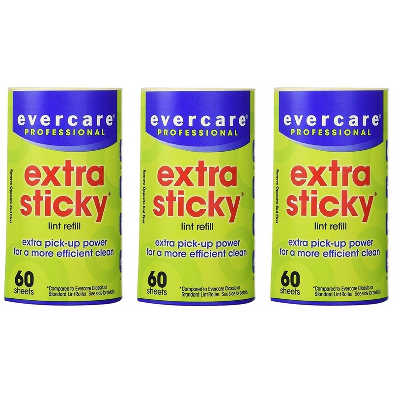 About Evercare extra sticky roller refill, 60 sheets (3 pack - 180 sheets) America's #1 selling lint roller 50% stickier - new dry cleaner grade tape - extra sticky 60 sheets pick up lint, dirt, dandruff and pet hair. - zip strip technology - Total 29.8ft. X 4in. per roll Compared to Evercare classic or standard lint roller. Based on independent tests results following ASTM guidelines and specifications for Evercare lint roller products. Individual results may vary based on various factors. Made in USA.