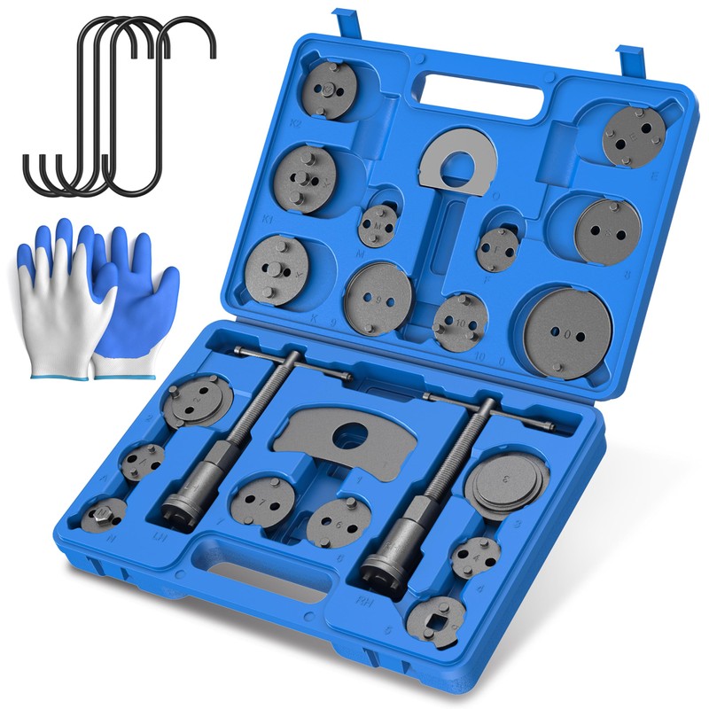 - Package includes: EVERESTWAY Universal Brake Caliper Piston Tool Includes 18 pieces Silver Disc Adapters fit into car, truck or 4-wheel drive disc brake vehicle, 2 pieces Retaining Plates, 2 pieces Thrust Bolt Assemblies, 4 Pieces Hanger hookers.