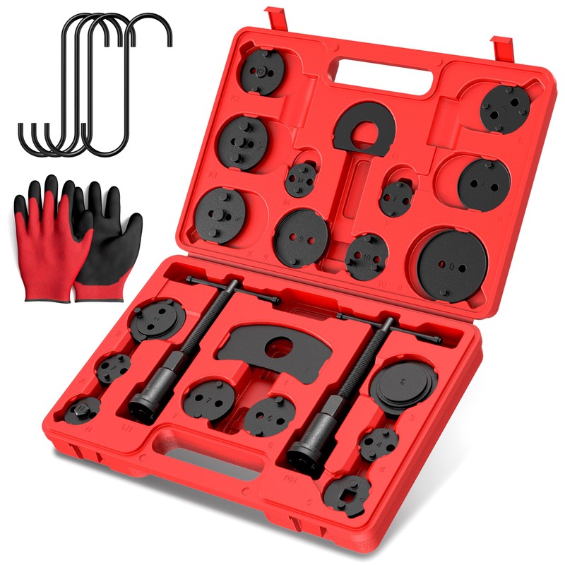 - Package includes: EVERESTWAY Universal Brake Caliper Piston Tool Includes 18 pieces Black Disc Adapters fit into car, truck or 4-wheel drive disc brake vehicle, 2 pieces Retaining Plates, 2 pieces Thrust Bolt Assemblies, 4 pieces Brake Caliper Hooks, 1 pair of Gloves.