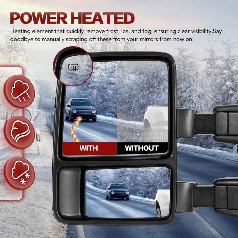 - [MULTI-FUNCTION]:Featured power heated plane mirror that could remove fog&snow; dual glass(Flat + convex glass) provides a clear visibility. Built in arrow light & turn signal light enhance driving convenience and safety.