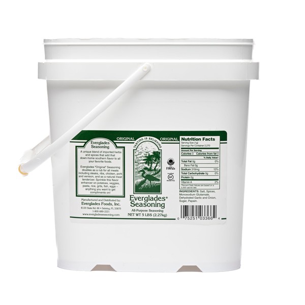 5 Pound Bulk Tub- Everglades All Purpose Seasoning brings out the delicious flavor of steaks, hamburgers, chicken, potatoes, soups, eggs, vegetables, popcorn you name it.It's great on any food.Use before, during or after cooking. Use on your table to replace your salt and pepper.