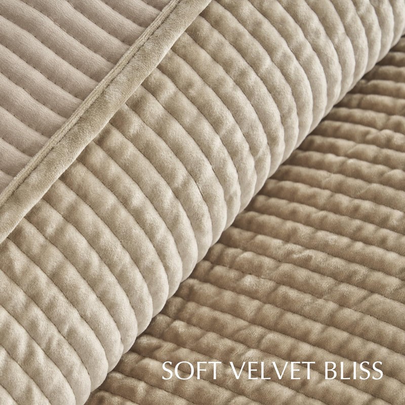 - TIMELESS ELEGANCE QUILT - Elevate your bedroom decor with our channel velvet quilt set. Crafted to perfection, the subtle shimmer of the unique crushed velvet material evokes a captivating sense of luxury and sophistication. Its striking allure ensures it becomes the centerpiece of any room, whether as a standalone feature or layered with other textures, infusing your space with elegant refinement.