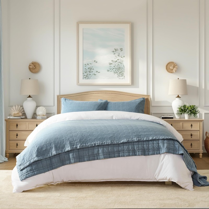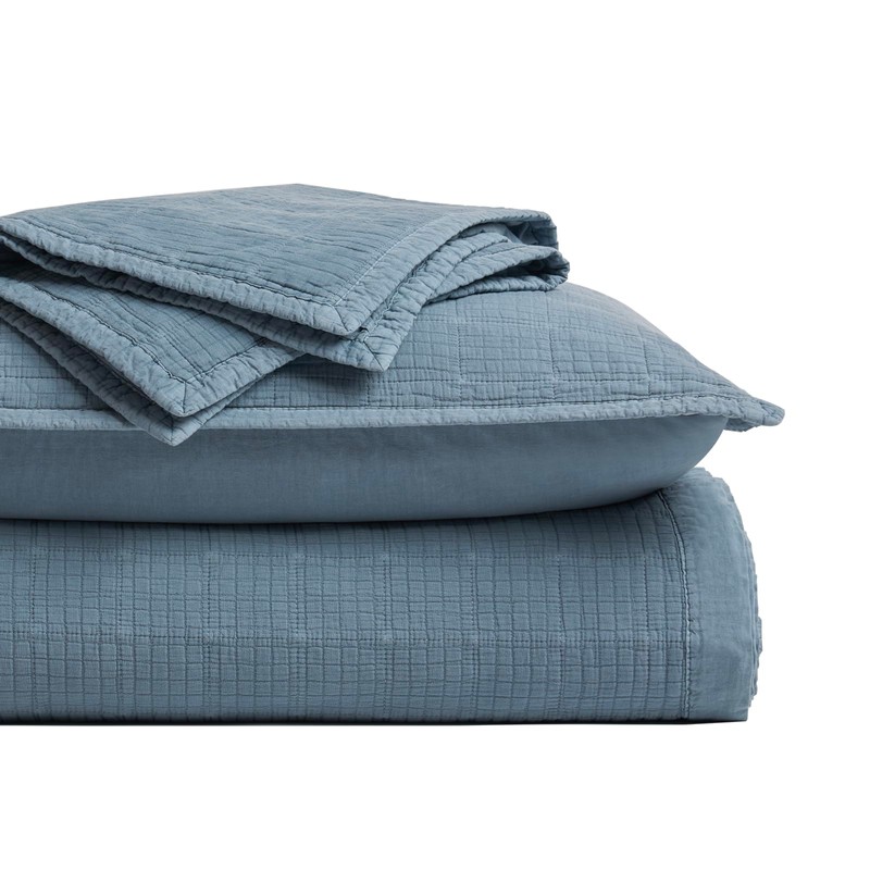 EVERGRACEHOME Stonewashed Cotton Quilt Set Queen Size, Ultra Soft Oversized Bedspread Coverlet Set, Lightweight Crinkle Box Stitch Bedding Sets for All Season, with 2 Matching Shams, Sonoma Blue