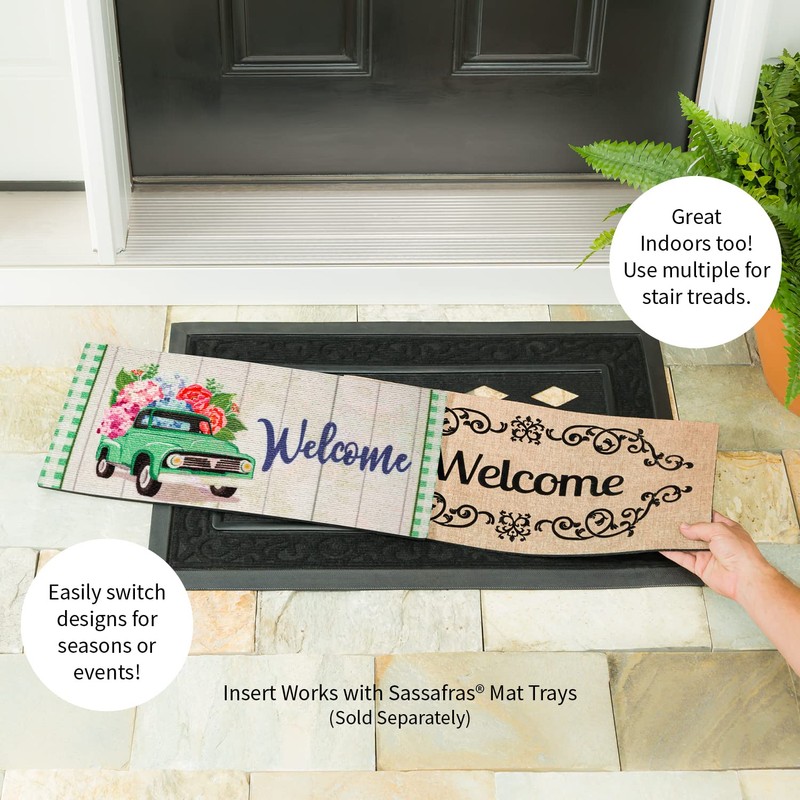 - Our exclusive Sassafras mat is the perfect way to dress up your front door and showcase your personality. Every Sassafras mat is sized perfectly at 22" x 10" to use as a stand-alone mat, or fit inside one of our coordinating Sassafras heavy duty rubber trays (sold separately - click the link on our store to shop frame styles).