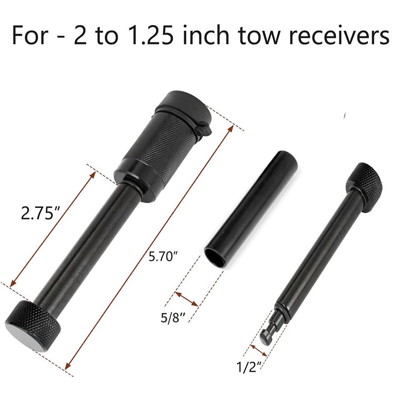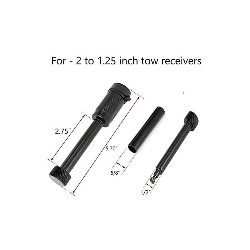 - ★Hitch Cover Pin Lock Set for 1-1/4" and 2" inch trailer hitch Receivers. Universal Fit - 1.25" Receiver with 1/2" Diameter Hardened Black Locking Hitch Pin and 2" Receiver 5/8" Sleeve Adaptor, This Trailer Receiver Hitch Lock Fits Class I, II, III & IV Hitch Receivers.