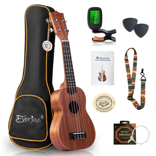 Everjoys Mahogany Soprano Ukulele Starter Kit - Professional 21 inch w/Case Strap Tuner Aquila Strings Pick (Natural Mahogany)