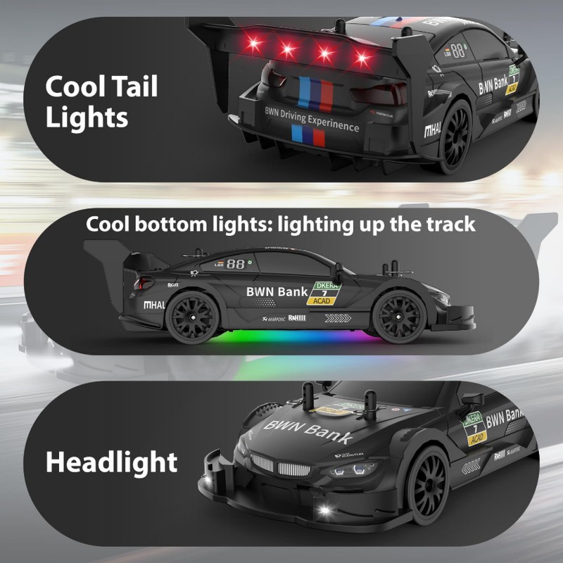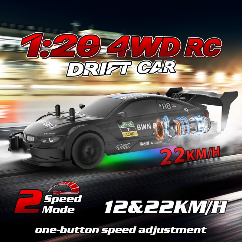 High-speed rc drift car: The 1:20 4WD rc car is easy to operate yet incredibly fun! Its responsive steering and powerful engine allow it to easily pull off a variety of impressive maneuvers: U-shaped drift, S-shaped drift, 360° drift.With a top speed of 22 km/h, it's both thrilling and addictive.At night, the colorful LED lights on the bottom of the rc sport car create an impressive drifting atmosphere. Whether you're a beginner or rc cars hobby, you'll enjoy the thrill of drifting!