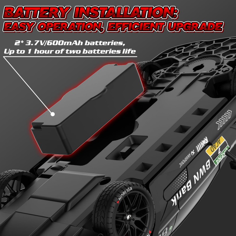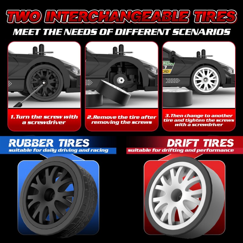 2.4GHz and Dynamic Light: This 4WD RC drift car features a 2.4GHz radio for stable control up to 30 meters, making it an ideal drift car for both kids and adults.The automatic pairing function ensures that multiple people can play together without interference.The drift rc car features dynamic headlights, taillights, and bottom lights. You can freely switch lighting modes to suit different scenarios, nhancing your control experience and making every drift an unforgettable memory!