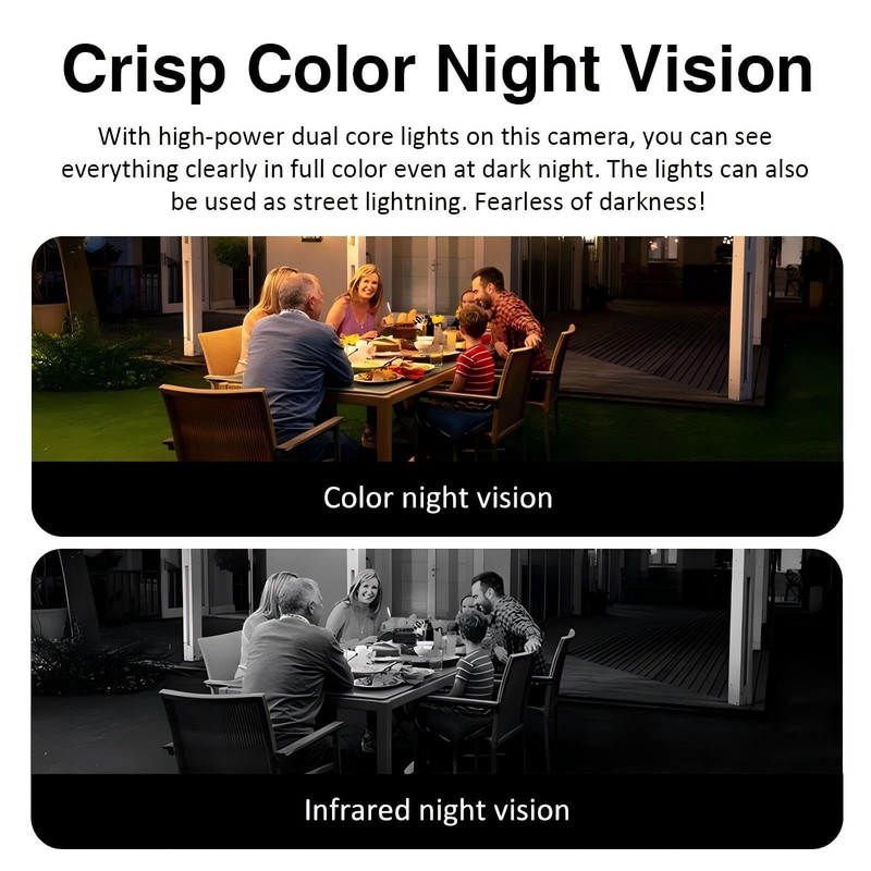 - 【Vivid Night Vision & Interactive Audio】This exterior PTZ camera, complete with infrared and warm light LEDs, offers color/IR night vision capabilities up to 60 feet. It maintains clear imaging even in pitch-black environments through its full-color night vision. The camera provides three different night vision modes for your selection. With its dual-lens design, it also includes a built-in speaker and microphone, enabling real-time interaction with visitors or the deterrence of intruders via the mobile app, from anywhere.