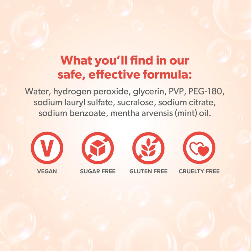 OmniFoam's bubbles get into all the tricky areas of the mouth including around crowns, implants, and bridges. The hydrogen peroxide-based formula kills 99.999% of bacteria for optimal cleaning, gum and tooth health. OmniFoam can be used with daily brushing, in trays, and as a rinse allowing even those with limited mobility to achieve good oral care.