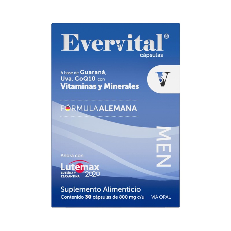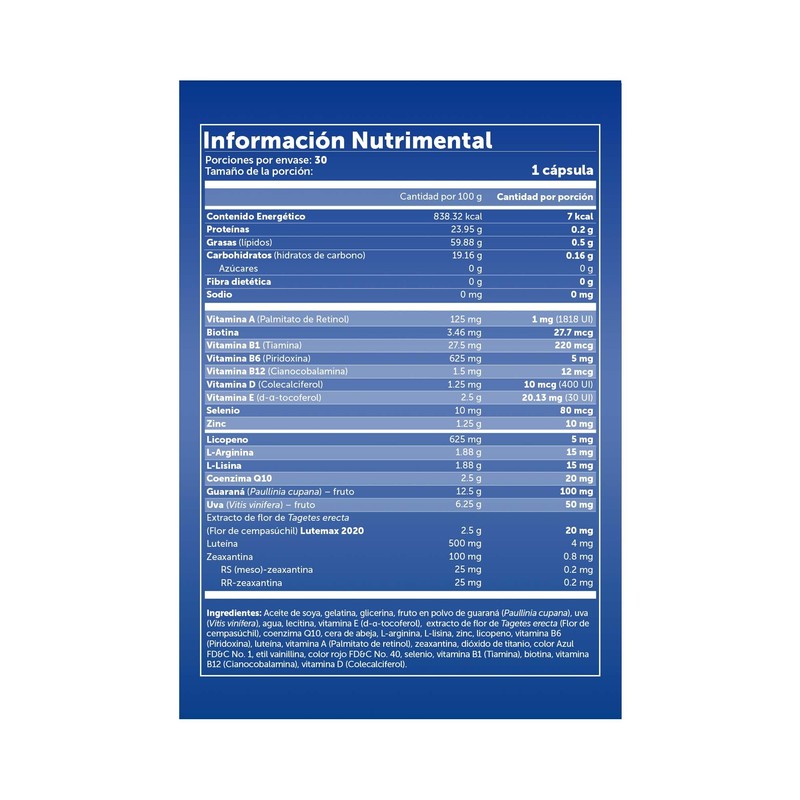 - A base de Guaraná, Uva, Coenzima Q10, Licopeno, Vitaminas, Minerales y Lisina que el cuerpo del hombre requiere para proteger o prevenir ciertos padecimientos y mantener niveles adecuados de energía todos los días.