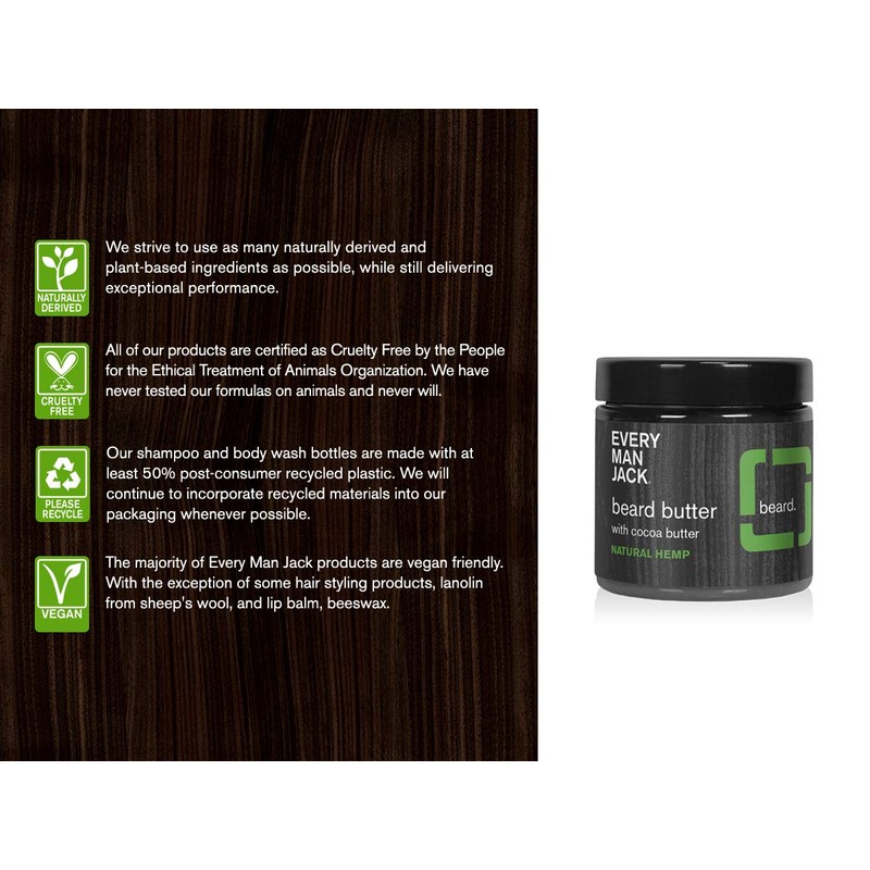 - Responsibly Made: Every Man Jack products are certified Cruelty Free by the People for the Ethical Treatment of Animals Organization (PETA) and are never tested on animals. Additionally, Every Man Jack Beard Butter is made without the use of parabens, phthalates, and dyes.