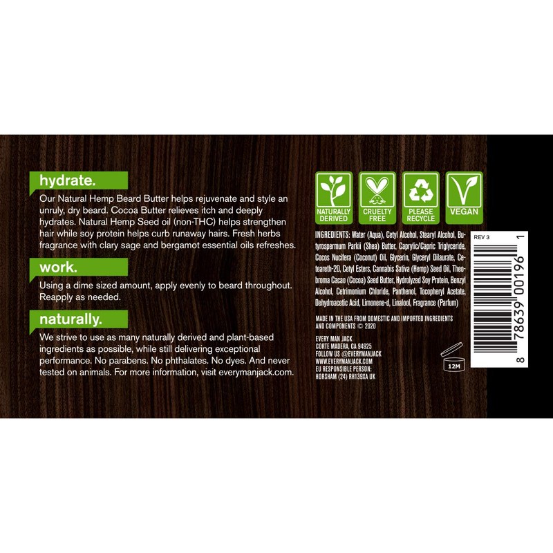 - Naturally Derived: Every Man Jack Narual Hemp Beard Butter is made from naturally derived ingredients. Cocoa butter helps to relieve itchiness and provides a deep hydration, while natural Hemp Seed oil (non-THC) strengthens and soy protiens curb runaway hairs, all while leaving a refreshing fresh herbs fragrance.