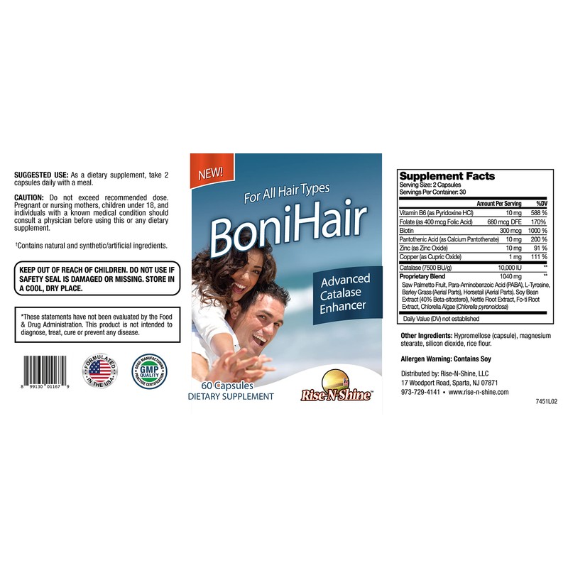 Rise-N-Shine BoniHair Catalase Supplement for Vibrant, Youthful Hair Support - 10,000 IU Catalase with Saw Palmetto, Biotin, Fo-Ti, PABA - 180 Capsules - Pack of 3 (90-Day Supply)