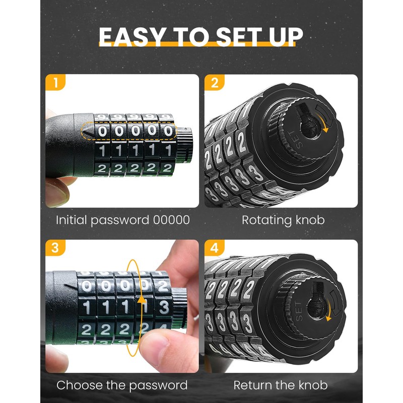 - Warm Reminder: Don't lock your bike outside for a long time. Especially in high-crime areas. No bike lock cable is 100% safe. Passwords are resettable and please set your own password combination,default password is 00000. Some models of scooters cannot support the wheel lock method, please compare carefully.