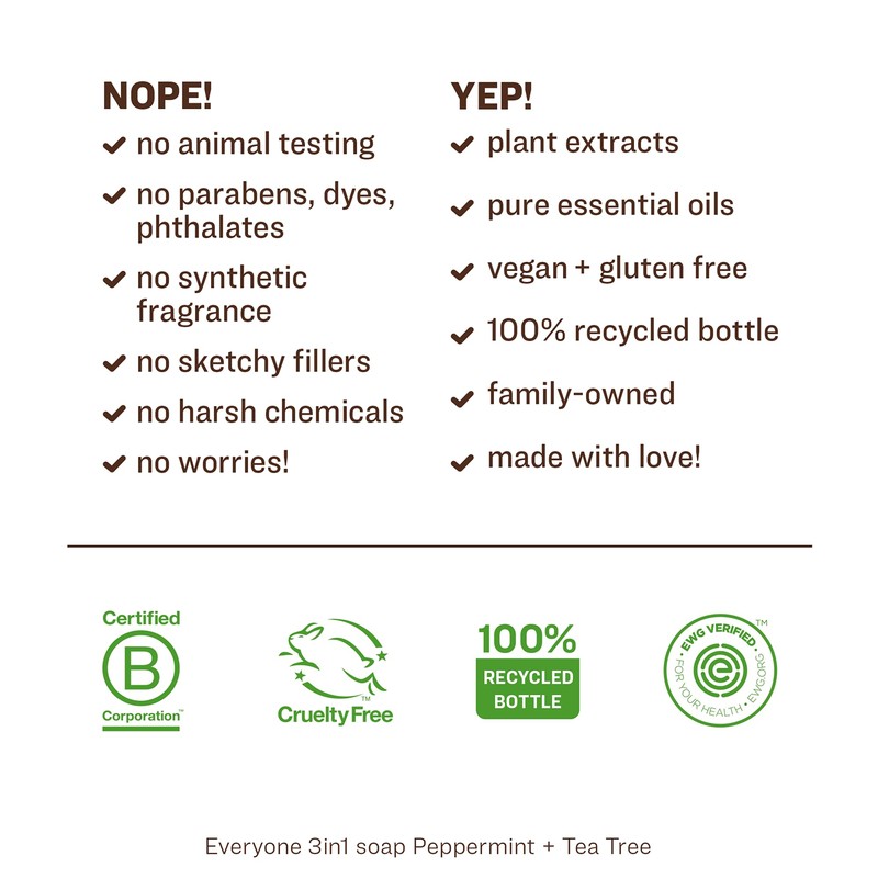 • Contains (2) 32 Ounce Bottles of Peppermint Tea Tree 3in1 Soap