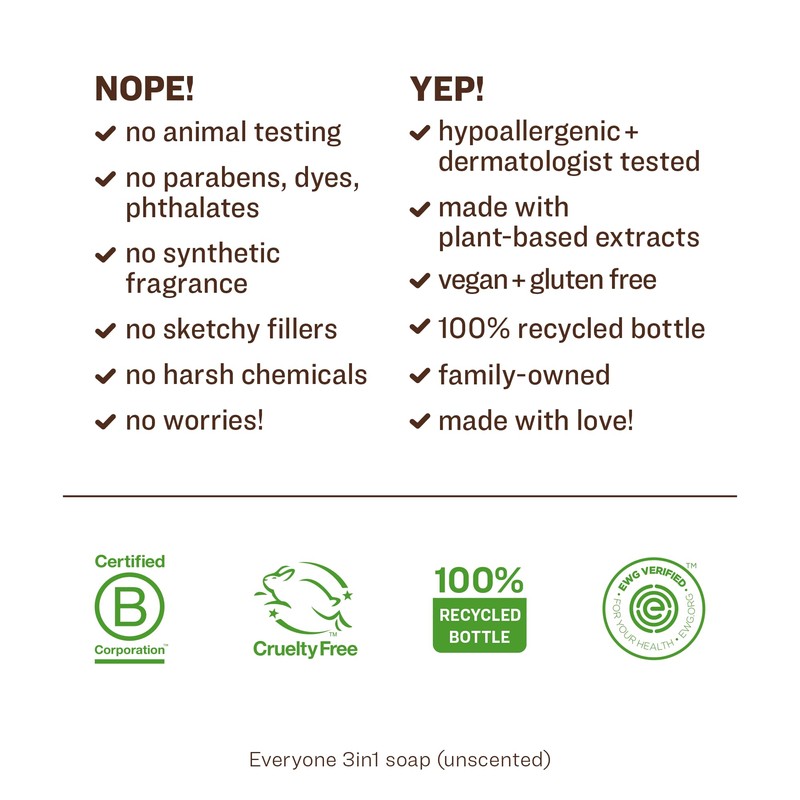 - Clean Promise: Everyone 3in1 Soap is EWG verified, GMO free, cruelty free, gluten free, triclosan free, and synthetic fragrance free