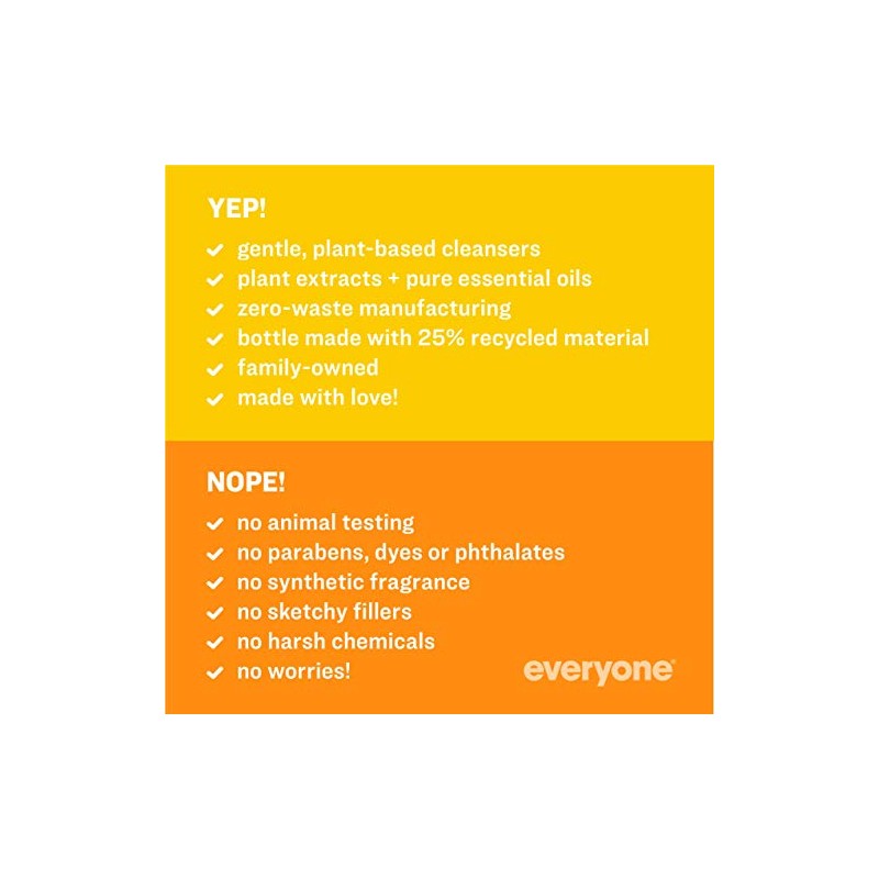 Meet a real multitasker. Everyone 2in1 Nourishing Lotions are light enough for the delicate skin on your face and moisturizing enough for hands and everywhere else. Made from natural botanicals and organic ingredients, this EWG verified lotion is safe for the entire family. We combine skin-loving ingredients such as vegetable glycerin, coconut and sesame seed oils, with our organic herbal blend of aloe vera, calendula, chamomile, and white tea extracts that provide long-lasting hydration thats deeply moisturizing but quick to absorb with no greasy residue (yuck). At EO Products, we believe the best resources come from nature. That is why we are committed to our zero-waste mission. Our products are always made with reduction and repurposing in mind, this includes our recyclable packaging. Since 1995, we've made our products from domestic and imported ingredients in our family-owned and -operated factory in San Rafael, California. We learned early on that the only way to meet our own high standards was to take responsibility for everything ourselves. From our family to yours, enjoy.