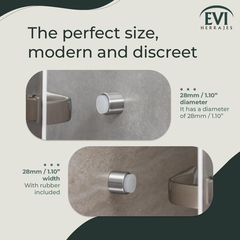 Stainless steel wall door stops. Our V2A (AISI 304) stainless steel wall door stops stand out for being practical, robust and elegant. The wall door stops are the perfect option when it is not possible to install a floor stop, or if you want to leave the floor free of obstacles for its cleaning, for example. Following these simple tips, you will achieve perfect attachment: Choose the appropriate placement point. Clean the floor thoroughly; for wooden floors, with a damp cloth and then dry well; for terrace floors, with a cloth dampened in alcohol and then dry well. Remove the protective plastic; do not touch the adhesive area with your hands. Choose the location well and place the stop. Very important: press for better attachment and avoid moving it once installed. (the adhesive may lose adherence if the stop is manipulated once installed. ) Try not to bang the door too hard with the stop during the first 24 hours; the adhesive achieves its optimal level of functioning after 24 hours The manufacturer 3m recommends warming the adhesive slightly before its installation (for example, with a dryer or heat gun), in order to soften the adhesive briefly; recommendations