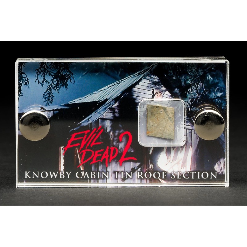 This great mini display contains a section of the tin roof from the Knowby cabin in the second Evil Dead movie!