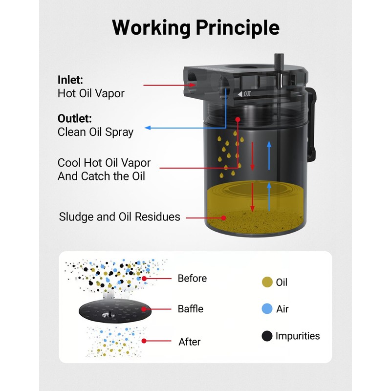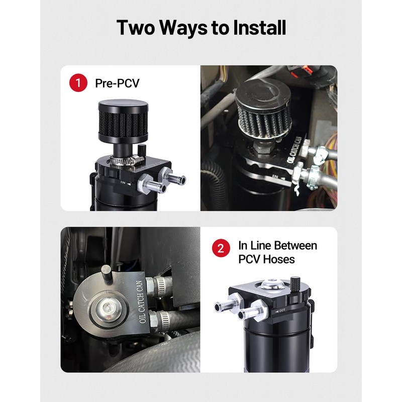 - [Breather Filter] You can install the oil catch can with Breather Filter for pre-PCV cars as a vent system or without breather filter in line between PCV hoses as a seal can, all for your option.