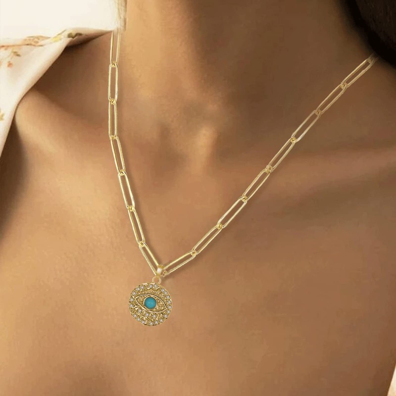 - EYE PENDANT NECKLACE FOR MEN: Evil eye necklace is a kind of amulet. Wearing a special evil eye charm, also called a mati, is said to help prevent the curse from even happening and bring good luck to you.