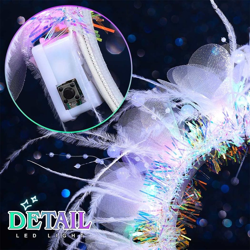 - Die LED-Feder-Stirnbänder sind in Einheitsgröße für die meisten Kopfformen erhältlich. Das modische, süße, romantische und elegante Design lässt Sie im Dunkeln charmanter und auffälliger aussehen.