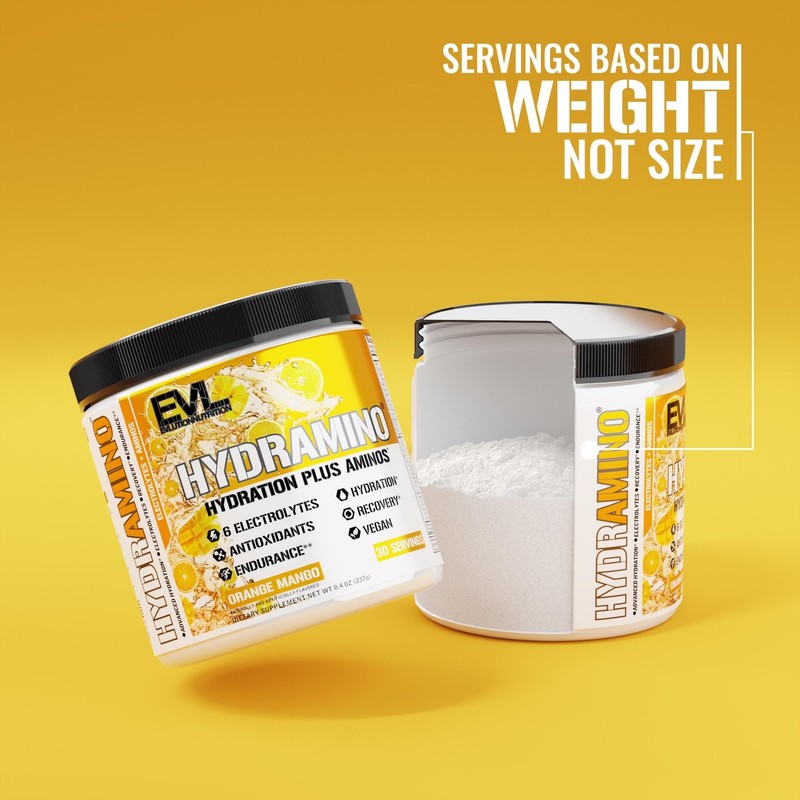 Evlution Nutrition HYDRAMINO Complete Hydration Multiplier, All 6 Electrolytes, Vitamin C & B, Fluid Boosting Aminos, Coconut Water, Endurance, Recovery, Antioxidants, 30 Serve, Orange Mango