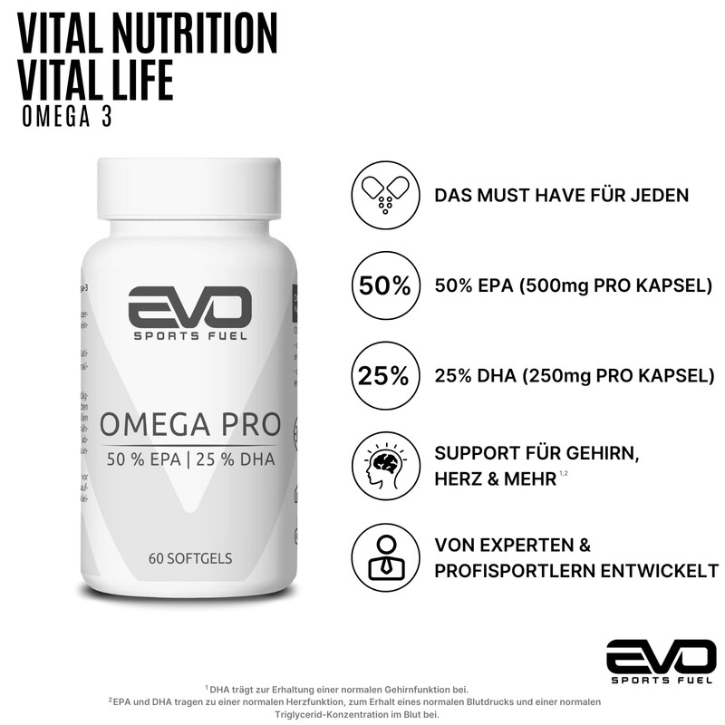 EVO SPORTS FUEL Omega Pro, 60 capsules, 2250 mg Omega 3 per daily dose with 1500 mg EPA and 750 mg DHA, supports heart, brain and more, tested quality, made in Germany