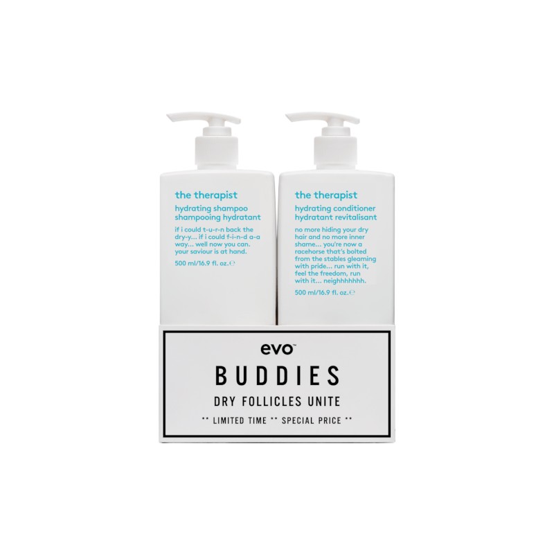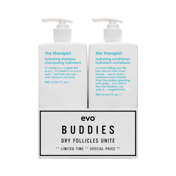 Evo The Therapist Shampoo and Conditioner 500ml Duo Pack includes Evo The Therapist Hydrating Shampoo and Evo The Therapist Hydrating Conditioner, both designed to moisturize, strengthen, and soften hair while improving shine and manageability.