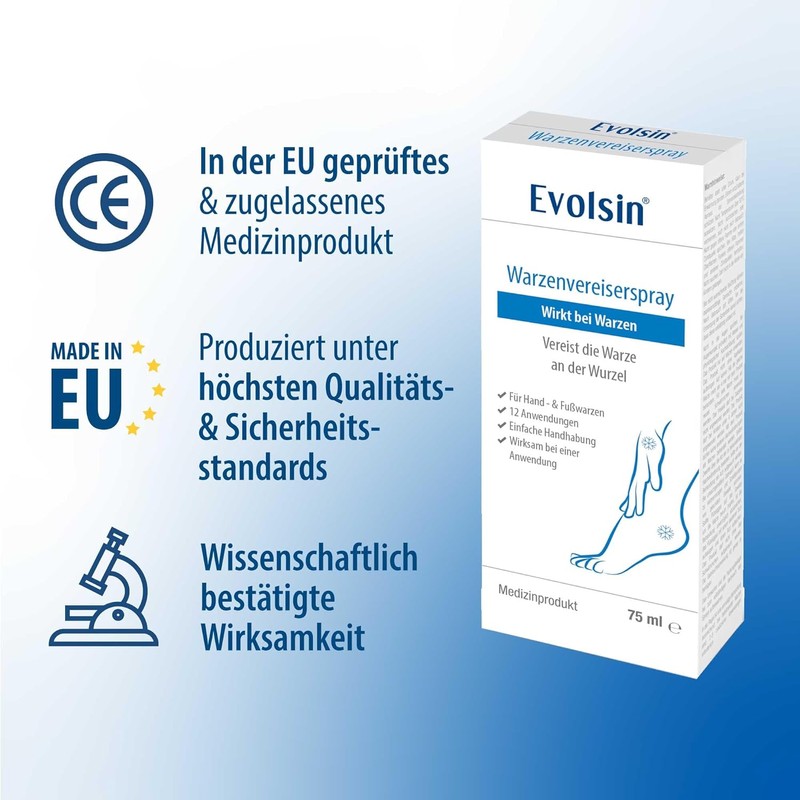PREMIUM GERMAN QUALITY: Evolsin Wart Ice Spray is a certified medical product, manufactured exclusively in Europe under the highest quality and safety standards — now conveniently available on Amazon.