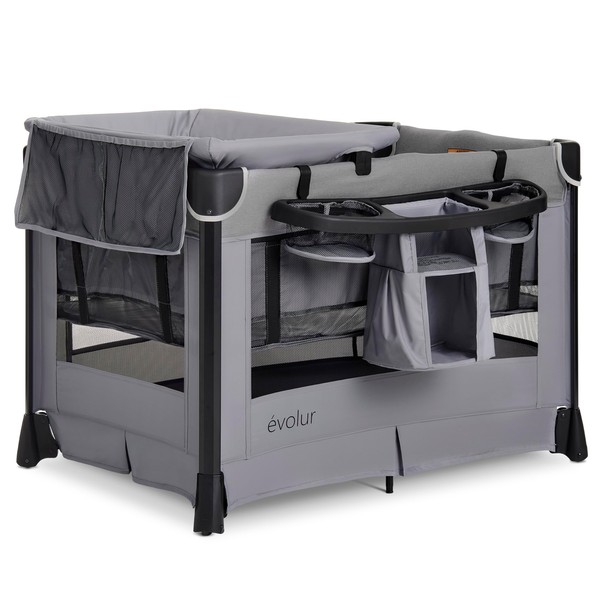 Evolur Cozy Cove All-in-One Portable Playard with Bassinet & Changing Table – Quick-Fold Travel Playard with Breathable Mesh Sides (Newborn–Toddler) Grey