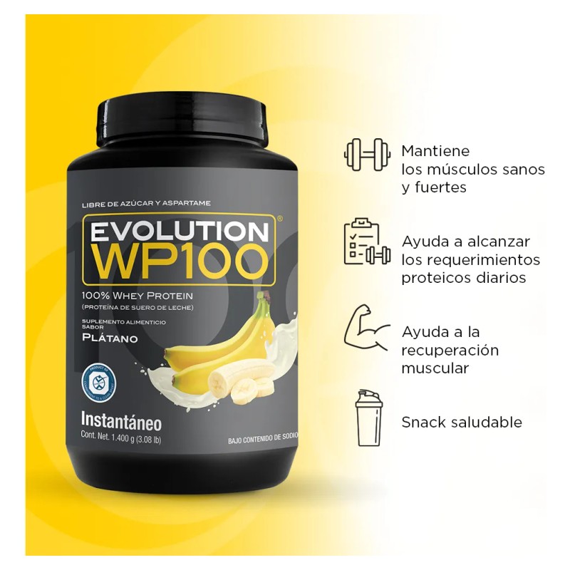 Con su presentación de 1400g, tienes la garantía de un suplemento rendidor que te acompañará en tu día a día, aportándote la fuerza y vitalidad que necesitas para superar tus metas. Ya sea mezclada con agua fría, leche o en tus recetas fitness favoritas, la WP100 Evolution sabor Plátano se convertirá en tu compañero ideal para un estilo de vida saludable, lleno de energía y resultados visibles. 🌟🏋️♂️