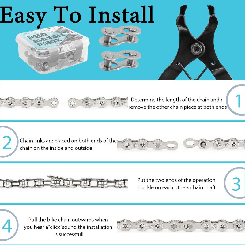 The kit includes 10 pairs of 9-speed bike chain magic buckle and a pair of special installation plier, easy to carry, a must-have accessory for your bike.