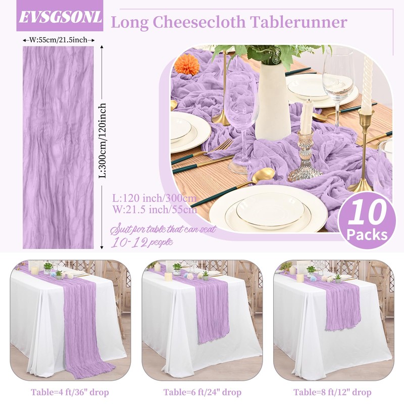 EVSGSONL 10 Pack Cheesecloth Table Runner Light Purple,10 ft Gauze Table Runner Long Semi-Sheer Rustic Boho Table Runners for Wedding,Bridal Shower,Party,Banquet Decoration(21.5 x 120 Inch)