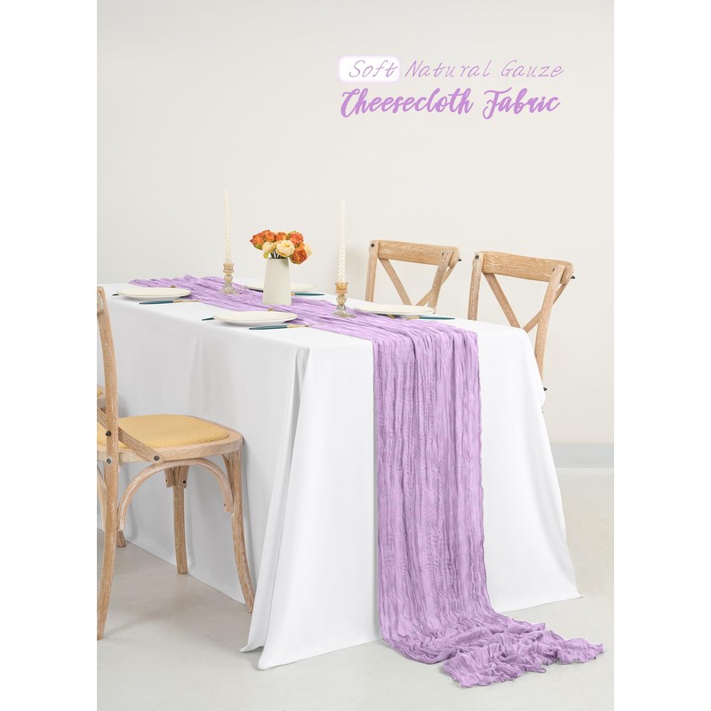 - Extra-long Size:Each light purple cheesecloth table runner measures about 21.5 x 120 inches/55*300 cm.Long enough to match with rectangle tables up to 8 ft .You can also use this extra long gauze table runner fits with round tables up to 90 inch with effect of draping 15 inch. Wrinkle texture table runners just looks really chic and aesthetic,can also be used for wedding arches,chair sashes,fireplace,cheesecloth napkins,backdrop draping.
