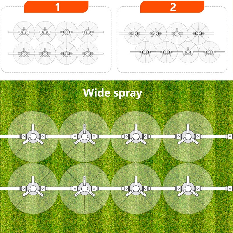 • Three‑way propeller design, each sprinkler irrigation rod has 4 different angles of water outlets, spraying and irrigation are even, covering a large area.