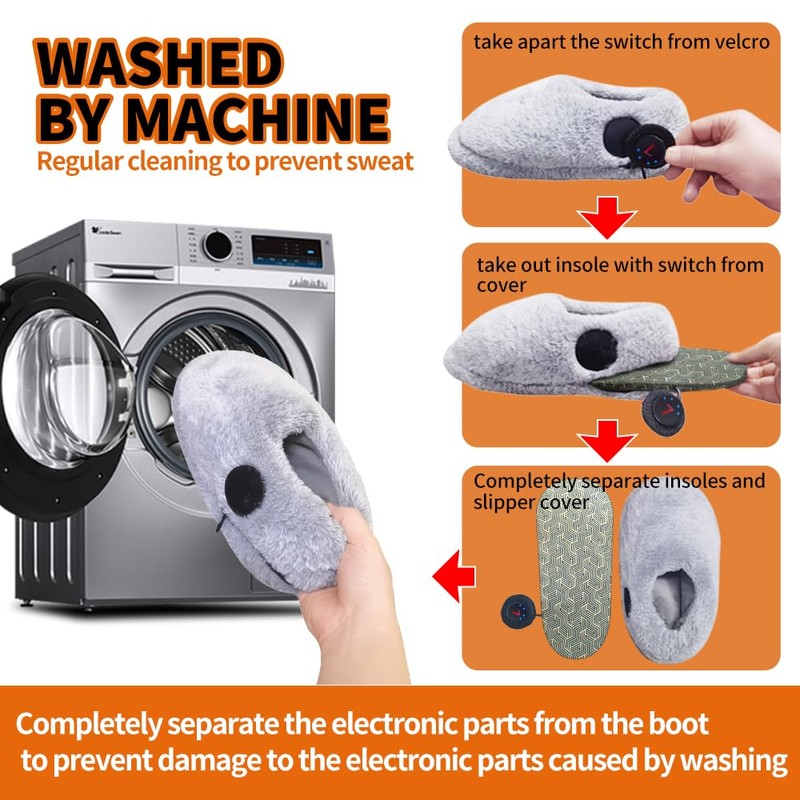 - 🔥EASY TO WASH: This product has a patented removable and washable structure. the external bonded switch and the independent insoles with lithium battery compartment can be taken off from the slippers cover together. The boots cover can be washed repeatedly, which greatly increases the product life and keeps it clean