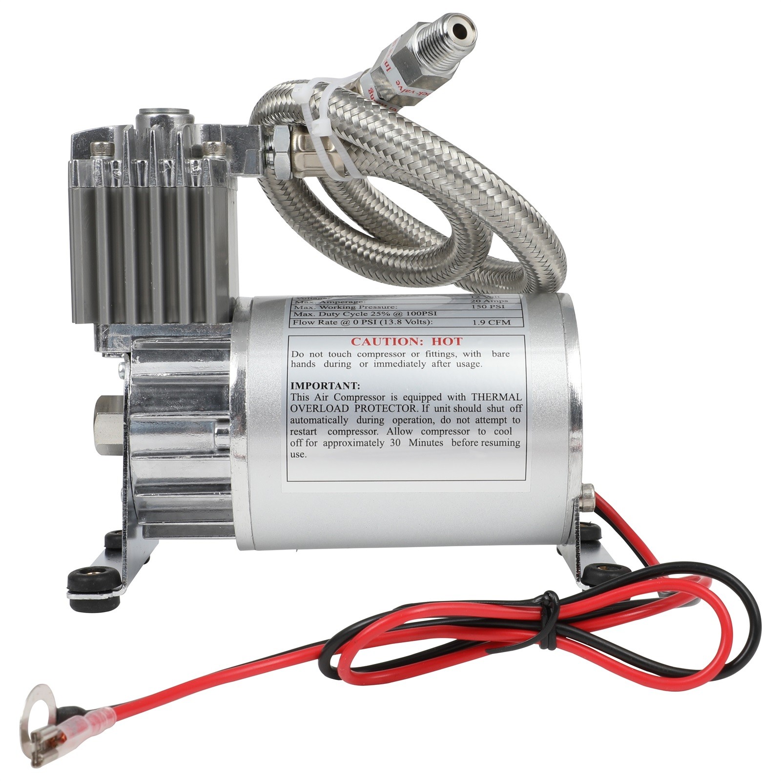 Product Information: This on-board system is specifically designed for air suspension but can also be used with any high-pressure air horn or power tool that requires an on-board air system. Comes with a 0.5 Gallon steel air tank featuring 5 air ports of 1/4" NPT, one 150 PSI heavy duty chrome look air compressor and mounting hardware.